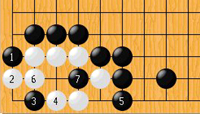 如图1,白棋在角部走成的就是“大猪嘴”,若黑方先走,先在左侧1位扳,然后3位点,5位立,7位扑,白棋无法做成两个眼,是死棋。这就是大猪嘴的杀法。 虽然我在实战过程中没有遇到过大猪嘴,但是我知道学围棋一定要学会大猪嘴,因为大猪嘴的杀棋过程,几乎包含了围棋的全部杀棋内容——扳、点、扑、跳、立等。为了更好地理解大猪嘴的杀法,我和妈妈在网上查了好多关于大猪嘴的资料,其中有首围棋童谣非常有趣: “一只小懒猪,睡觉打呼噜; 灰狼来吃它,扳扳点接扑。”