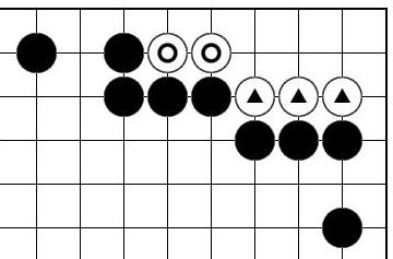 下面是我根据童谣编的一个故事:从前有一只小懒猪(指图2白棋),整天睡觉,有一天,它被大灰狼(指上图的黑棋)盯上了(就像上图显示的那样,白棋被黑棋包围了),大灰狼立即冲进屋里把小懒猪给吃了。 小猪嘴能打劫活,但是得有充足的劫材,因为如果劫材不够那就打不赢劫,打不赢劫就无法活。